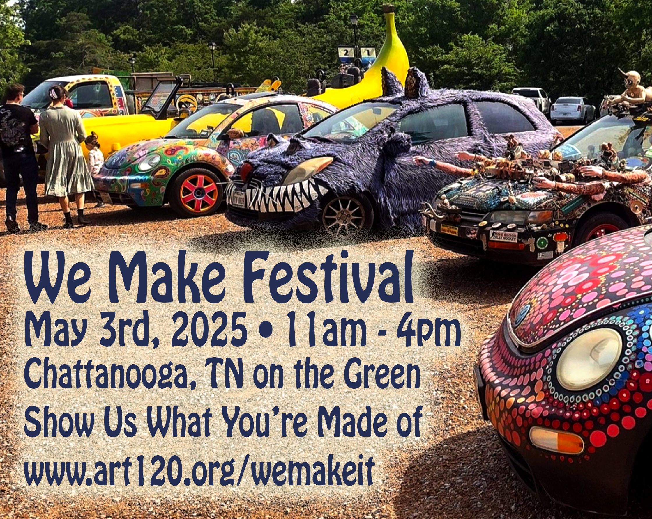 Art 120 invites makers of all ages to join the fun in Chattanooga on Saturday, May 3rd and show us what you're made of at the We Make Festival. From 11am to 4pm on the Chattanooga Green, attendees can expect art cars from around the country, live performances, maker exhibits, international food, and an UpCycle Fashion show. There are cash prizes and awards for youth entries and booth space is available. Come see us at the TN Maker Fest to learn more.